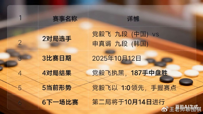 在刚刚结束的2025年第三届烂柯杯世界围棋公开赛决赛首局中,中国棋手党毅飞九段执黑中盘战胜韩国“第一人”申真谞九段,在三番棋决赛中拔得头筹,以1:0领先。这场胜利不仅让党毅飞拿到了赛点,也打破了近期中国棋手对阵申真谞的僵局,意义非凡。仅是个人见解:
